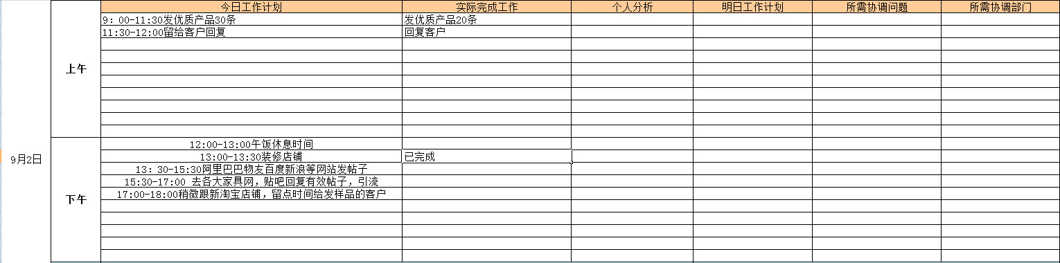 每天上班前,给自己定一个工作计划,然后在每个点上看是否完成,并作记录,并总结原因,下班前再计划第二天工作计划,每天不断更正。相信时间久了,工作会越来越顺利。