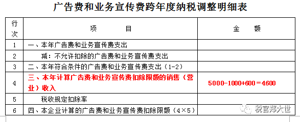 在这里特别注意:在填写企业所得税申报表广宣费表时,其中的第四行:本年计算广告费和业务宣传费扣除限额的销售(营业)收入,应自己按上述公式计算后填入。如下图: