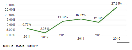 PIPE这种投资方式也在 2016出现了井喷式的增长,从过去几年的占比4%-5%直接上涨到了今年的11.95%。德勤研究发现这种增长也是因为中药企业的发力,从2015全年的36起PIPE投资案例到2016年前8个月的48起,中药企业PIPE投资案例的占比从19.44%上升到了39.58%。